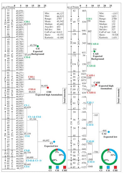 The anomalous mineralized zone of the investigated area in BOC is represented by CIII and CAIII, which each have two sub-clusters: CIII-i, CIII-ii, and CAIII-i and CIII-ii. A total of 27 and 11 magnetic observations were made for CIII-i and CAIII-i, respectively, equaling 2% and 1% data coverage. CIII-i values ranged from 46,091 nT to 46,276 nT, while CAIII-i values ranged from 939 nT to 1423 nT, with an average magnetic value of 46,181 nT and 1166 nT, respectively.