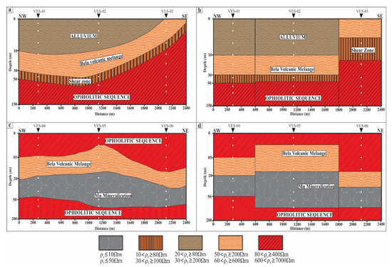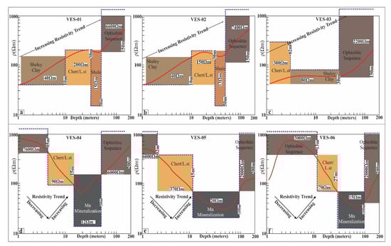There are several methods for analyzing geoelectrical data, including graphical and analytical methods [50]. For modeling resistivity data, the most modern and advanced analytical procedures employ specialized computer-iteration software [51]. In the current work, the analytical approach is used to model resistivity data using the iteration program IPI2win. The qualitative interpretation is used to determine the true resistivity, thickness, and depth of various lithological units encountered in the study area. The geoelectrical resistivity data are fed into the iteration software, and the results (iteration curves) are displayed on a computer screen alongside the Rho model curves vs. depth (AB/2). Table 1 displays the IP values estimated at various depths for VES-01 to VES-06. The resistivity curves of VES-01 to VES-03 positioned along low-anomalous zone A1 reveal four distinct lithological units: shale, shaley clay, chert/l.st, and the Ophiolitic sequence (Figure 7). The VES-04 to VES-06 are arranged along a high-magnetic-anomalous zone representing three lithological units: the Ophiolitic sequence, the chert/l.st of the Bela volcanic melange, and Mn mineralization with low resistivity. The resistivity of lithological units ranges from 13–15 m for shale, 40–80 m for shaley clay, 70–370 m for chert/l.st, 2000–7400 m for the Ophiolitic sequence, and 15–20 m for Mn mineralization. An IP survey confirmed the presence of Mn minerals with a high IP value because the resistivity range of Mn mineralization is similar to that of shale. IPI2win is used to generate the resistivity pseudo section and resistivity sections of both low- and high-anomalous zones to depict the distribution of lithological units at depth (Figure 8). The pseudo section and resistivity section along the low-magnetic-anomalous zone reveals a well-developed shear zone with depths of 30 m along VES-01 and VES-02 and less than 10 m along VES-03 (Figure 8a,b). The pseudo section and resistivity section along the high-magnetic-anomalous zone show Mn mineralization that is concordant with the strata. Mn mineralization is sandwiched between the Bela volcanic melange and the Bela ultramafic sequence at depths of 20 m along VES-04, 10 m along VES-05, and 30 m along VES-03 (Figure 8c,d). The resistivity section reveals that the depth of Mn mineralization is increasing toward the NE, indicating that shallow units should be drilled on the SW side.