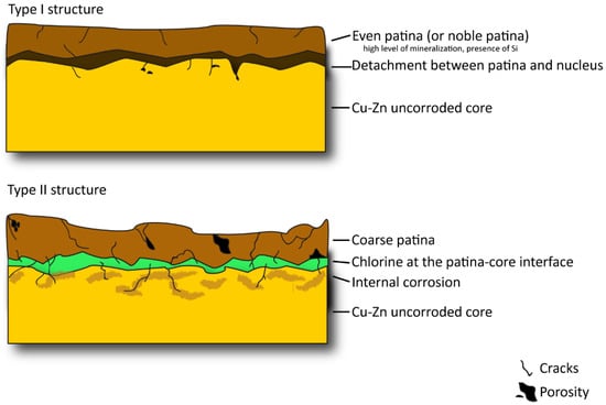Schematic representation of the Type I (up) and Type II (down) corrosive structures of orichalcum samples. In the scheme the damages that occurred in both types of structures are evident, highlighting the highest degree of degradation in Type II, due to cracks and induced porosity causing internal corrosion and the settlement of chlorine-rich fluid at the patina–core interface.