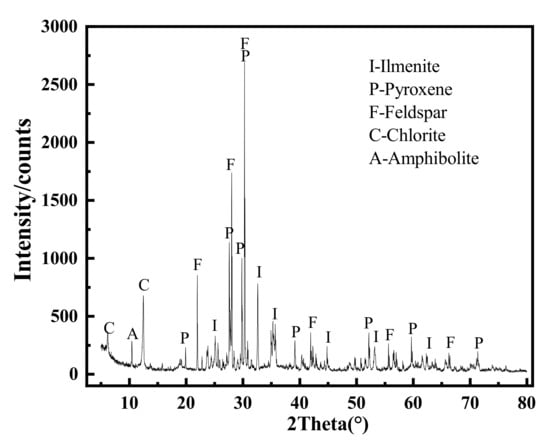 The ilmenite sample obtained from the product of crushing from a ilmenite processing plant in Panzhihua was used in this study. Subsequently, the ore particles was dried and sampled to analyze the sample properties. The results of chemical multi-element and X-ray diffraction (XRD) analysis are shown in Table 1 and Figure 1, respectively. The TiO2 content in the sample was 10.33%. The phase analysis of titanium in the sample are listed in Table 2. The content of the ilmenite in the sample was 5.64%, and that of the gangue minerals titanomagnetite and rutile, accounts for 0.29% and 0.12%, respectively. In addition, the TiO2 distribution with variation of the particle size in the sample was analyzed using the combination of wet sieving and chemical multi-element analysis, and the results are shown in Table 3. The results showed that approximately 67.1% of TiO2 distributes in the minerals with particle size more than 74 μm, and particularly, 12.54% of TiO2 distributes in the portion less than 38 μm.
