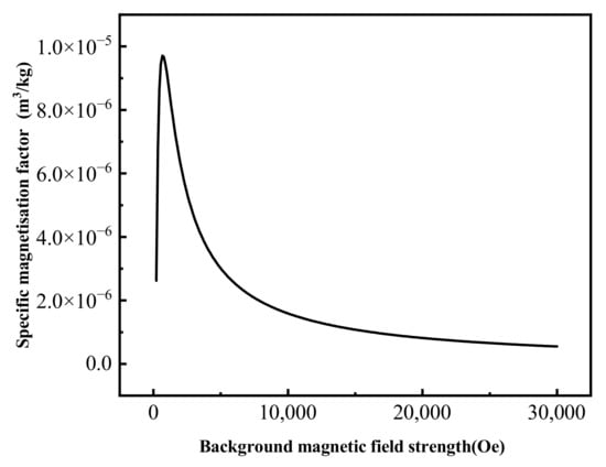 The specific magnetic susceptibility of ilmenite samples is determined by a vibrating sample magnetometer (VSM). The VSM test results are shown in Figure 2, the background magnetic induction intensity of the effective sorting area is about 0.65 T, and the specific magnetic susceptibility of the minerals is about 2.0 × 10−6 m3/kg.