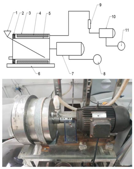 Schematic diagram of the radial turbulent outer-cylinder magnetic separator (1—feed hopper; 2—sealing ring; 3—fixed cylinder; 4—magnetic system; 5—sorting cylinder; 6—frame; 7— motor; 8, 11—frequency converter; 9—flow meter; 10—booster pump).