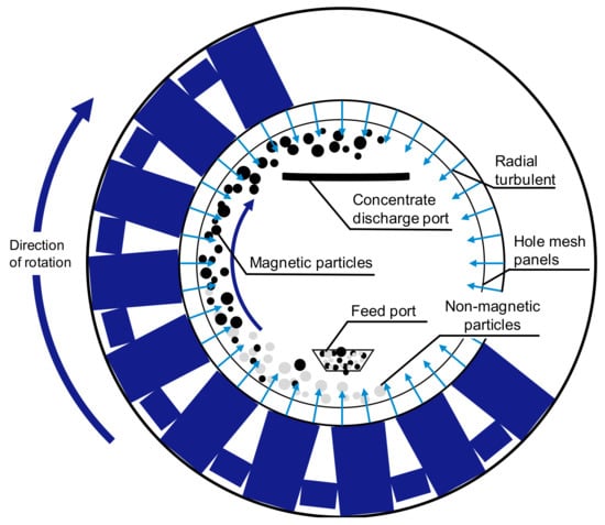 Weakly magnetic mineral resources are characterized by low grade usable minerals, nonuniform embedded particle size, and complicated co- and association of minerals with various specific magnetism coefficients [1,2,3]. Pre-concentration equipment should be able to handle a wide particle size feed and simultaneous pre-concentration of minerals with varying specific magnetization coefficients in order to achieve high efficiency and low cost pre-concentration of these minerals [4,5,6,7]. It also combines the benefit of being low-cost and simple to maintain. The development of external magnetic cylinder-type magnetic separation equipment has been a significant topic for scientific researchers in recent years [8].