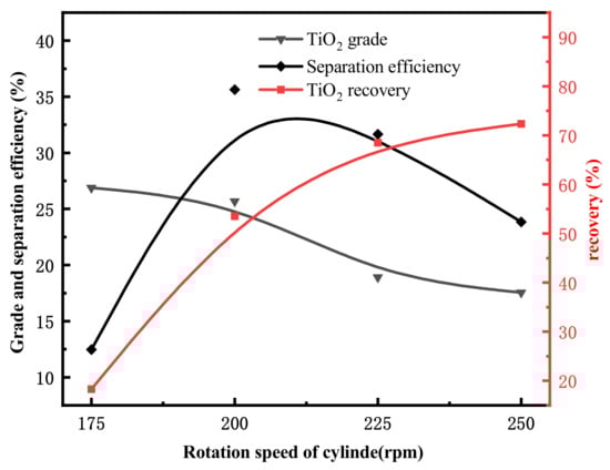 The effect of rotation speed of the cylinder in the separation zone of the radial turbulent outer-cylinder magnetic separator was first studied, with water flow as 2.0 m3/h, feed size −0.075 mm, constant magnetic field intensity 0.65 T, and the inclination angle of the cylinder is 0°, respectively. As shown in Figure 5, the rotation speed of the sorting cylinder has a very significant effect on the concentrate grade, the titanium recovery of concentrate product and separation efficiency. Both recovery and separation efficiency increased with increasing rotation speed. When the rotation speed increased from 175 rpm to 250 rpm, the recovery increased from 18.28% to 72.34%. A maximum recovery and separation efficiency gained at the rotation speed of 225 rpm. Increasing the rotation speed will result in a decrease in separation efficiency. In terms of concentrate grade, it was found virtually negatively correlated with the rotation speed of the cylinder. When the rotating speed is 175 rpm, the concentrate grade is the highest, which is TiO2 26.88%; when the rotation speed is 250 rpm, the concentrate grade drops to 17.55%. The rotation speed of the cylinder determines the retention time in the separating cylinder, thus posing a significant impact on the separation performance of the separator. In terms of separation efficiency, in the speed range from 175 rpm to 200 rpm, the separation efficiency increased from 12.46% to 35.63%, but when the speed was further increased until 250 rpm, the separation efficiency gradually decreased to 23.85%. As can be seen from Figure 5, a rotation speed of 175–225 rpm was suitable for the tested minerals. A too slow rotation speed of cylinder, nevertheless, would inevitably decrease the solids throughput of the separator.