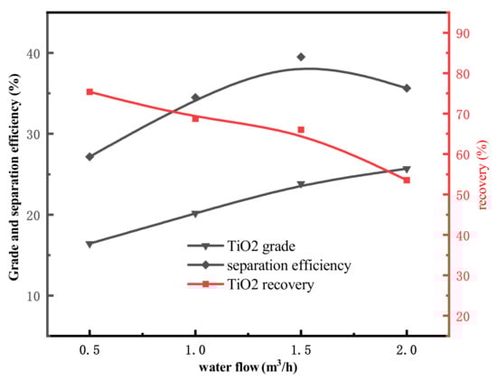 Rinse water was introduced in radial turbulent outer-cylinder magnetic separators to improve the quality of magnetic products by eliminating particles trapped in the captured magnetic particles. Therefore, adding rinse water can generally give higher concentration grades. One condition worth noting is that the equipment pores have a tendency to become clogged when the water flow rate is 0 m3/h. Therefore, water flow rate must be greater than 0 m3/h. The effect of water flow was also conducted, with the separator at a rotation speed of the cylinder 200 rpm, feed size mm, constant magnetic field intensity T, the inclination angle of the cylinder was 0°, respectively. The effect of water flow in the separation zone of the radial turbulent outer-cylinder magnetic separator was conducted. As shown in Figure 6, the water flow has the opposite effects on the concentrate grade, the titanium recovery of concentrate product and separation efficiency compared to the rotation speed of the cylinder. Both grade and separation efficiency increased with increasing water flow. When the water flow increased from 0.5 m3/h to 2.0 m3/h, the concentrate grade increased from 16.43% to 25.68%. In terms of the titanium recovery of concentrate product, it was found virtually negatively correlated with the water flow. When the water flow is 0.5 m3/h, the recovery is the highest, which is 75.36%; when the water flow is 2.0 m3/h, the concentrate recovery drops to 53.52%. The water flow determines the reverse competitiveness of the ores in the sorting process, thus posing a significant impact on the looseness of the particles. In terms of separation efficiency, in the water flow from 0.5 m3/h to 1.5 m3/h, the separation efficiency increased from 27.17% to 39.51%, but when the water flow was further increased until 2.0 m3/h, the separation efficiency gradually decreased to 35.63%. As can be seen from Figure 6, a water flow of 1.0–2.0 m3/h was suitable for the tested minerals.