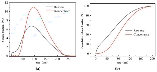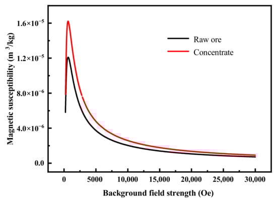 The comparison of the laser particle size results in Figure 7a,b shows that the raw ore is mm, while the concentrate is mm. The distribution curve and cumulative curve indicate that the particle size in the concentrate is coarser than in the raw ore, and that during the sorting process, the fine-grained minerals are more affected by the dragging force of the water than by the magnetic and centrifugal forces and are difficult to be captured by the magnetic and centrifugal forces into the concentrate. As can be seen from the VSM test results in Figure 8, at a field strength of approximately 0.65 T at the surface of the sorting cylinder, the magnetic susceptibility of the concentrate is approximately 3.64 × 10−6m3/kg, compared to 2.96 × 10−6m3/kg for the raw ore, and the concentrate product is more magnetic.
