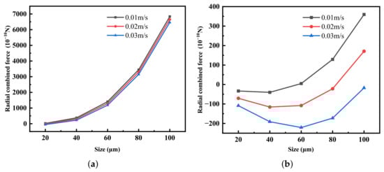 A computational analysis of the influence of the radial disturbance on the forces on mineral particles was carried out to investigate the mechanism of the effect of the radial disturbance on the movement of mineral particles during the sorting process. When the speed is 200 rpm, the relationship between the combined force on different types of particles in the radial direction and the particle size and radial water flow rate is shown in Figure 9a,b.