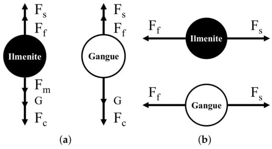 Schematic diagram of the force of mineral particles; —the fluid drag force; —the friction force; —the magnetic force; —the centrifugal force; G—gravity force. (a) Radial force, (b) Axial force.