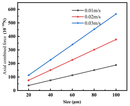 The relationship between axial force and axial flow velocity for different particle sizes.