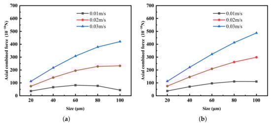 The relationship between the axial combined force on different types of particles and the particle size and axial water flow rate. (a) Ilmenite, (b) Gangue minerals.
