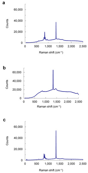 Polarized, single-crystal Raman spectra of olivine inclusions. (a) On the polished surface of the diamond LN50D68. (b) Below the polished surface (LN50D73). (c) Below the polished surface with a low EPMA total (LN50D96). Olivine inclusions with normal and low EPMA totals show the same or similar micro-Raman spectra.