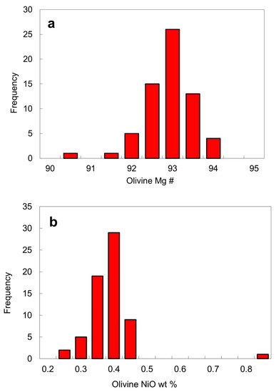Olivine. Approximately 47 olivine inclusions were analyzed in this work (Table 2) and additional EPMA analyses of olivine inclusions from the Fuxian kimberlites are also available in the literature [3,16,17]. Olivine inclusions typically have a high Mg # of 92–94. Mg # is defined as 100Mg/(Mg + Fe2+) by atom where all Fe is assumed to be Fe2+ for olivine and Fe3+ is calculated in the case of chromite. The peak position for the Mg # of olivine is 93, a value that is slightly lower than average Mg # of 94 for worldwide olivine inclusions [1,32,33], but similar to those of olivine inclusions from the Akwatia diamonds [24]. Only two olivine inclusions have a Mg # that is outside the range of 92–94 (Figure 9a). The NiO contents of the olivine inclusions are usually in the range of 0.25 to 0.45 wt. % and are concentrated around 0.4 wt. % (Table 2; Figure 9b). One exceptional value is for the olivine from the diamond LN50D62, which has up to 0.80 wt. % NiO. Due to the wide NiO range (0.25–0.45 wt. %), the constant Ni content assumption for mantle olivine for the Ni-in-garnet thermometer may not always be valid [34,35].
