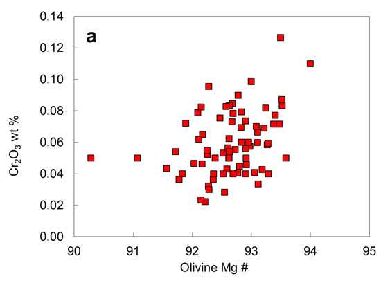Chromium contents of the olivine inclusions (Table 2; Figure 10a) all fall within the normal reported range of olivine inclusions in diamonds [24] and appear to increase with Mg #, likely owing to different degree of depletion in the mantle. If an olivine inclusion touches or is close to a chromite inclusion in diamond, an apparent high Cr2O3 content of the olivine may be caused by secondary X-ray fluorescence of Cr in chromite by Fe in olivine [25,26]. Therefore, a low accelerating voltage (10 kV) is preferred for analysis of olivine inclusions in olivine-chromite pairs in diamond. The unusually high Cr content of olivine inclusions in the Akwatia diamond [24] should be checked for fluorescence effect. Nonetheless, high Cr contents in isolated olivine inclusions are likely be real. Chromium enrichment in olivine might result from specific P-T conditions, crystal-chemical factors, or reduction of Cr, which may enter olivine as Cr2+ under reduced conditions [36] or high crystallization temperatures [37,38]. Sutton et al. [39] showed that Cr is predominantly divalent in lunar olivine.
