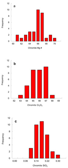 Histograms of chromite inclusions in diamond: (a) Mg #; (b) Cr2O3; (c) SiO2. The data are listed in Table 3.