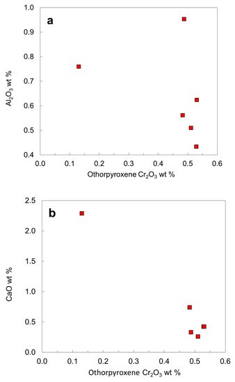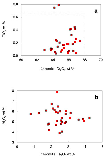 Except for two inclusions with 0.79 and 0.75 wt. % TiO2, the TiO2 contents (0.03–0.45 wt. %) of most chromites falls within the compositional range defined by worldwide chromites (maximum 0.65 wt. %), located in the "diamond inclusion field" for chromites (Figure 12a). On a Fe2O3 vs. Al2O3 diagram, analyses of chromite inclusions fall within a limited compositional range (Figure 12b). The recalculated Fe2O3 of the chromite inclusions is less than 4.5 wt. %. The SiO2 contents of chromite inclusions are high, from 0.08 to 0.29 wt. %, with a pronounced peak around 0.18 wt. % (Figure 11c). The solution of silicate-spinel component is favored by high pressure [42], consistent with the high Cr2O3 contents that stabilize spinel towards higher pressures in lherzolites [43].