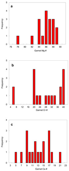 Histograms of garnet inclusions in diamond: (a) Mg #; (b) Cr # defined as 100Cr/(Cr + Al) by atom; (c) Ca # = 100Ca/(Ca + Mg) by atom. The data are from Table 4.