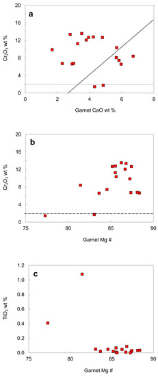 Figure 14c shows that only lherzolitic garnets with the lowest Mg # contain significant amounts of TiO2 (0.41 and 1.08 wt. %), while the other garnets contain less than 0.09 wt. % TiO2. The Al/Cr ratio in garnet was taken as a measure for the fertility of the source, as there is a positive correlation between Al/Cr ratio and Ti in lherzolitic garnets [24]. However, there is no positive correlation between Al/Cr ratio and Ti content for the garnet inclusions from the No. 50 diamond association.