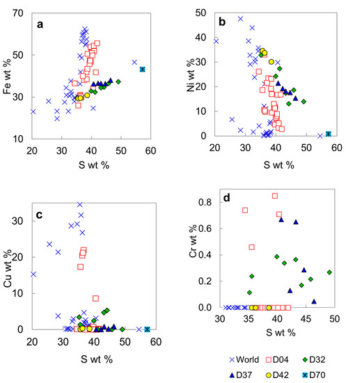 Compositional plots for sulfide inclusions in diamond from the No. 50 kimberlite diatreme: (a) S versus Fe; (b) S versus Ni; (c) S versus Cu; (d) S versus Cr.