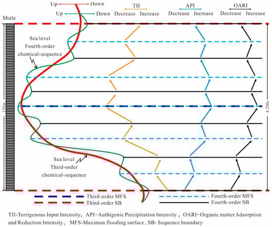 The second step in developing our method was to establish a theoretical chemical sequence stratigraphy model that could be used to divide the sequence and system tracts according to the optimized geochemical element combination index. Chemical sequence stratigraphy is consistent with the transgressive–regressive (T-R) model of classical sequence stratigraphy. The basic theory of the T-R model is that taking the lowest point of relative sea level decline as the sequence boundary, the highest point of relative sea level rise as the maximum sea flooding surface, and a sedimentary sequence with a relative sea level rise and fall cycle as a sequence, the sequences can be divided into transgressive system tracts and regressive system tracts [36,37,38]. Chemical sequence stratigraphy also responds to the relative rise and fall of sea level, which is similar to the T-R model, and the sequences division method of chemical sequence stratigraphy is not determined by lithology, but by geochemical element combination indices. In transgressive systems with a rising sea level, the TII index shows a decreasing trend, while the API and OARI indices show increasing trends. In regressive systems with a declining sea level, the TII index shows an increasing trend, while the API and OARI indices show decreasing trends. The sequence boundaries are located at the maximum value of the TII index and the minimum values of the API and OARI indices, and the maximum sea flooding surface is located at the minimum value of the TII index and the maximum values of the API and OARI indices (Figure 1).