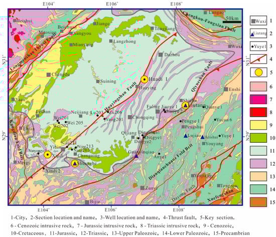 Geological map of the Upper Yangtze region (modified from a 1:500,000 Geological Map, [1]).