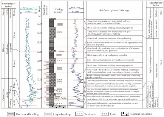 The Wufeng Formation (O3w) has a thickness of 13.74 m, is divided into upper and lower sections, and is in integrated contact with the underlying Linxiang Formation. The Longmaxi Formation (S1l) has a thickness of 486.4 m, is divided into upper and lower sections, and is in integrated contact with the underlying the Wufeng Formation and overlying the Shiniulan Formation. Lithologically, the Wufeng Formation mainly comprises calcium-siliceous mudstone, siliceous mudstone, carbonaceous mudstone, and silty mudstone. The lower section of the Longmaxi Formation comprises carbonaceous shale, shale, calcareous mudstone, and interbedded silty mudstone, with unequal thickness that is dominated by black shale. The upper section of the Longmaxi Formation comprises silty carbonaceous mudstone, carbonaceous silty mudstone, silty mudstone, mudstone, and carbonaceous mudstone. With respect to their sedimentary environments, the lower section of the Wufeng Formation is a silica-rich argillaceous deepwater shelf, the upper section of the Wufeng Formation and the lower section of Longmaxi Formation are argillaceous deepwater shelf microfacies, and the upper section of the Longmaxi Formation is a silt-rich argillaceous shallow water shelf microfacies (Figure 3).