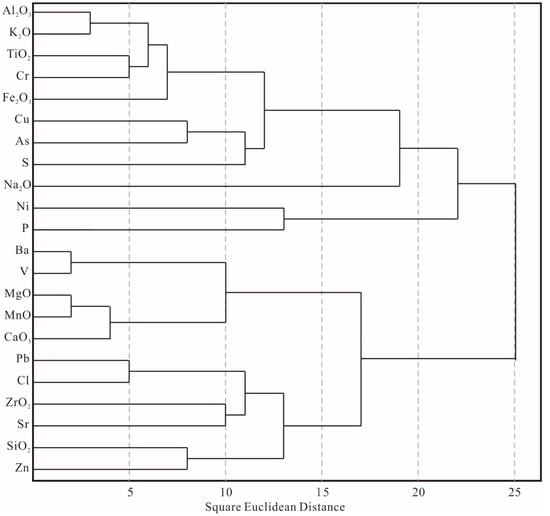 (3) Clustering analysis: As evident from Table 3 and Table 4, the load values of Al2O3, K2O, and TiO2 in principal component 1 were 0.823, 0.748, and 0.648, respectively, and the load value of Cr in principal component 2 was 0.661, which was higher than that in principal component 1 (0.506). The load values of CaO, MnO, and MgO in principal component 2 were 0.889, 0.585, and 0.626, respectively, and the load value of Sr in principal component 4 was 0.791. The load values of V, Ni, Cr, and Zn in principal component 1 were 0.638, 0.853, 0.506, and 0.532, respectively, all of which were very high.