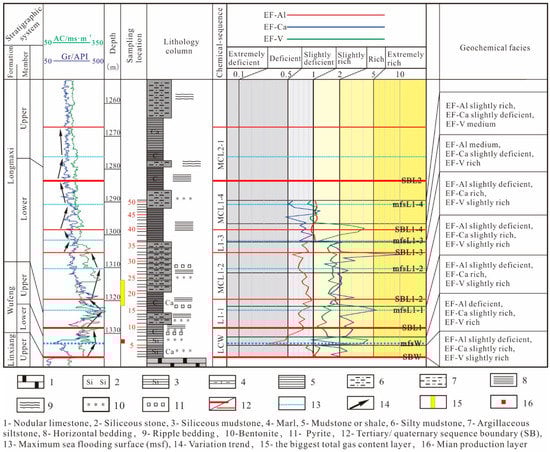 Chemical sequence and geochemical facies of a joint section in the Wufeng–Lower Longmaxi Formations in the upper Yangtze Region (LCW and MCL1-1 are dominated by EF-Al deficient, EF-Ca rich, and EF-V-rich chemical facies, which are shale gas favorable chemical facies. From bottom to top, EF-Al changes from deficient to rich, EF-Ca and EF-V changes from rich to deficient.).