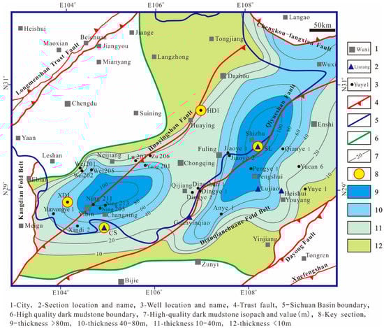 Isopach map of high-quality dark mudstone of the Wufeng–Longmaxi Formations in the Upper Yangtze region (modified from Wang et al., 2017). The SL section is located in the thickest depositional center of the high-quality dark mudstone, the HD1 well is located near the Huayingshan fault structural belt where the high-quality dark mudstone is the thinnest, and the CS section and the XD1 well are located between them.