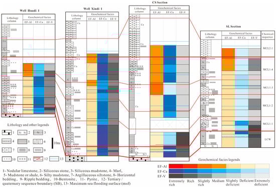 There are similar characteristics in the geochemical facies within the same chemical sequence of each section. LCW and MCL1-1 are dominated by EF-Al deficient, EF-Ca rich, and EF-V-rich chemical facies, which are shale gas favorable chemical facies. MCL1-2 and MCL1-3 are dominated by EF-Al slightly deficient, EF-Ca slightly rich, and EF-V slightly rich geochemical facies, and MCL1-4 is dominated by EF-Al slightly rich, EF-Ca slightly deficient, and EF-V slightly rich or slightly deficient geochemical facies. Vertically, from bottom to top, EF-Al changes from deficient to rich, and EF-Ca and EF-V changes from rich to deficient. There is obvious EF-Al enrichment and EF-V depletion near each chemical sequence interface, while EF-Al depletion and EF-V enrichment appear near each maximum flood surface (Figure 9).