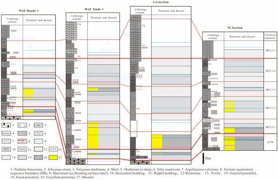 The joint comparison figure shows certain differences in the shale gas potential and the development of the sweet spot in each section (Figure 10). The SL section has the thickest and best shale gas potential, followed by the CS section. XD1 is thinner, and HD1 is the thinnest, which shows that the shale gas potential decreases from the deposition center to the uplift. For the shale gas sweet spot, LCW and MCL1-1 are the main development chemical sequences, whereas the numbers of shale gas sweet spots in MCL1-2 and MCL1-3 decrease. The MCL1-4 chemical sequence shows an underdeveloped sweet spot.