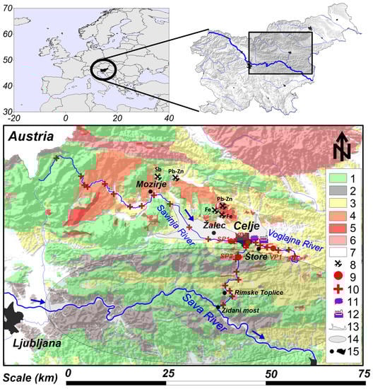 The Savinja river is a left tributary of the Sava river, which flows into the Danube river at Belgrade. Savinja originates in a glacial valley Logarska dolina in Kamniško-Savinjske Alps at an altitude of 1280 m.a.s.l. In the upper part, the river flows SE through mountainous landscapes composed mainly of carbonate formations of Triassic age, with the subordinate inserts of clastic rocks and volcanoclastites (andesite tuff, tuffite, volcanic breccia) [24]. Approximately 40 km from its spring, the river reaches the Celje basin lowlands at approx. 250–300 m.a.s.l. and starts flowing towards E for another 10 km. Sediments in the Celje basin are mainly of carbonate origin—gravel, sand, and silt. In the E part clays could be found. Savinja leaves the Celje basin at the town of Celje and turns south. In the next 20 km, it forms antecedent flow through Sava folds. Folding is perpendicular to the river course. The geological composition of Sava folds is very diverse: from Paleozoic clastic rocks and carbonates (Carboniferous, Permian age), Mesozoic carbonates (dolomite prevails), clastic rocks and tuffs, and Paleogene clastic rocks in the anticlines. Quartz containing keratophyre intrusions of Triassic age are also typical for this area [24]. Savinja flows into the Sava river at the town of Zidani most. The Savinja river catchment area covers 1864 km2. Its length is 107 km, and its drop is 750 m. Small-scale Sb–Pb–Zn-Fe mineral occurrences with small-scale historic mine developments (Zavrh, Železno, Lepa Njiva, Puharje and Galicija) are present in its catchment.