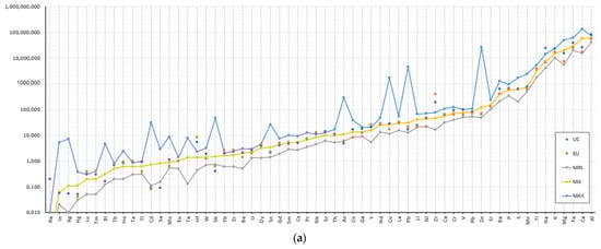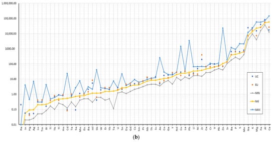 Minimum (MIN), median (Md) and maximum (MAX) levels of elements in the fractions <0.063 mm (a) and 0.063–0.125 mm (b), and comparison with the corresponding average values for European alluvial sediments (EU) [31] and the upper crust (UC) [32].