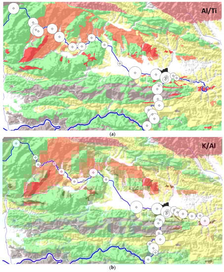To evaluate the impact of weathering of host rocks, we examined ratios of Al/Ti and K/Al. The Al/Ti ratio is an indication of alkalinity of the host rocks. In this study, the ratio varies between 9 and 25; if recalculated to oxides Al2O3/TiO2, the ratio is between 11 and 29, which suggests felsic to intermediate granitoids as host rocks [23]. Changes in the Al/Ti ratio could also be attributed to other factors. Sediments in sediment–sink areas have considerably lower Ti content, because the heavy mineral fraction tends to deposit in the upper parts of the river system, while the lighter, Al-rich fraction, can be transported further. The increased Al/Ti ratio can also be attributed to the presence of aeolian deposits in the sediments [5]. It is highly unlikely that changes in the Al/Ti ratio can be described with aeolian processes in this study, because the aeolian component in the Savinja and Voglajna river sediments is not expected to be significant. Changes are more likely caused by Al/Ti variation in host rocks and differences in depositional/erosional regime. Spatial distribution of the Al/Ti ratio in the fraction <0.063 mm (Figure 3a) shows that it has much larger values in the Savinja river than in the Voglajna river. This is probably the consequence of differences in the geological composition of the catchment area for both rivers. The geological composition of the Savinja river catchment area includes carbonates, andesite tuffs and keratophire intrusions [24], while the catchment area for the Voglajna river is predominately composed of younger clastic sedimentary rocks of Neogene age (mainly Miocene; [25]). It is also evident (Figure 3a) that the highest ratios are found in the mountainous areas, and lower values in the lowlands. Two potential explanations are proposed: a higher amount of fresh (unweathered) deposit in mountainous areas increasing this ration, while a higher amount of sediment weathering in basins is decreasing it.