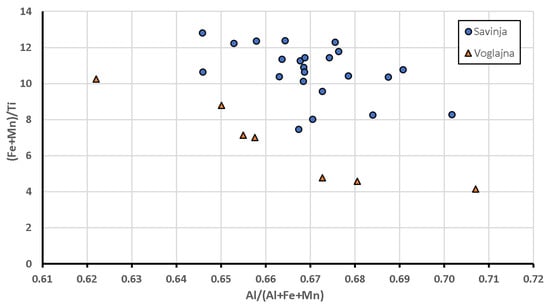 A plot of the (Fe + Mn)/Ti and Al/(Al + Fe+ Mn) ratios, indicators of the presence of hydrothermal or pyroclastic components, revealed clear differences between both rivers. Data points for the Savinja river (Figure 4) are placed in the upper part of the graph, indicating a higher amount of the pyroclastic component in stream sediments (<0.063 mm fraction), compared to the Voglajna river. Similarly, as in the case of the Al/Ti ratio, this observation can be interpreted by the presence of andesite tuffs and tuffites in the Savinja river catchment area. No such rocks are present in the Voglajna river catchment.