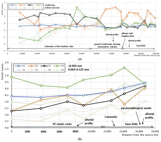 Factor analysis revealed four geochemical associations of elements. Factor 1 represents the first association. It is loaded with elements which are typical of anthropogenic contamination of sediments, including potentially toxic elements, such as Sb, Cu, Zn, Pb, Cd, and others [3,35,36,37,38]. The distribution of factor scores is heavily influenced by the presence of anthropogenic activities, such as ironworks, population centers, and waste dumps. A sharp peak in factor 1 score values is recorded in the Savinja river just after the affluent with the Voglajna river (Figure 5a), while in the Voglajna river, factor 1 score values are rising continuously from the headwaters towards its joint with the Savinja river in the industrialized town of Celje (Figure 5b). A sharp rise in factor 1 scores is also recorded in alluvial profile from the Voglajna river which was sampled in an industrialized area (Figure 7b). Factor 1 scores are also slightly higher in the coarser fraction, compared to the finer one. X-ray diffraction of sample with the highest calculated F1 score for the <0.063 mm fraction indicates the possible presence of traces of various Cu, Cd, Pb, Zn and Fe oxides, hydroxides and hydrates (Table 3). This suggests that leaking of metals from pyrometallurgical waste dump can be the main reason for this factor. The potential process for metal transport from waste dump to the alluvial deposit is the following. First metals ions dissolute in the waste heap by infiltrated rain water under anoxic low pH conditions—this dump also contains a lot of tar and other organic compounds as a result of coal gasification process used in the past to produce gas. Metals are then transported in the solution towards the Voglajna river by underground waters. Finally, these ions then precipitate in the geochemical barrier in sediments when underground water reach oxygen-rich alluvial sediments containing calcite, which increases pH. Another indication for this process is also the fact that the sample with the highest Factor 1 score values is depleted of carbonates (Table 3). More details about anthropogenic contamination and spatial distribution of selected pollutants can be found in previous paper [29] and will not be discussed in detail in this paper.