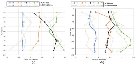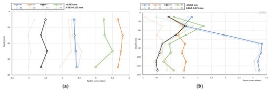 Figure 6 presents factor score values versus depth and granulometric fraction in the alluvial sediments of the Savinja river above (Figure 6a) and below (Figure 6b) the town of Celje, which is the main source of anthropogenic elements in the environment. The affluent between the Savinja and Voglajna rivers is located between these two profiles. Figure 7 presents factor score values in alluvial profiles of the Voglajna river, for the coarser and finer fractions separately. Profiles were excavated in a relatively uncontaminated area (Figure 7a) and below the main anthropogenic sources of contamination—the pyrometallurgical waste dump in Celje (Figure 7b).
