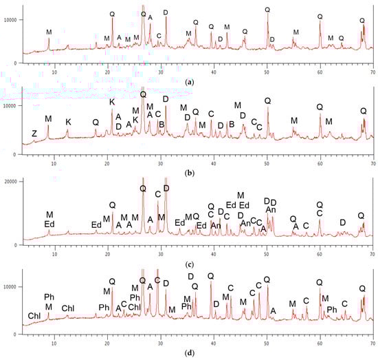 Obtained X-ray diffraction patterns for the samples where the highest values of factor scores were determined for the finer fraction (<0.063 mm) for the F1 (a), F2 (b), F3 (c) and F4 (d). The key for peak indicators is presented in Table 3.