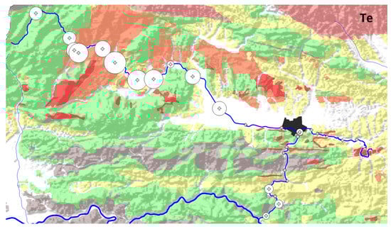 Factor 3 is loaded with Ca, Mg and Te. It is undoubtedly that the presence of this geochemical group is a result of weathering of carbonate rocks in the study area. This is also confirmed by the X-ray diffraction results, indicating that the sample where the highest factor 3 score values were calculated (fraction < 0.063 mm), contains the highest amount of dolomite, relatively high amount of calcite, and the lowest amount of quartz (Table 3). The presence of the mineral Edwardsite (Cu and Cd sulphate hydrate) within this sample is interesting, which might be a consequence of antifungal plant treatment with Cu–based substances in the area. The highest factor 3 score values are recorded in alluvial sediments of the Savinja river in its upper, mountainous parts of Southern Alps, which are composed mainly of carbonates (Figure 5). Factor 3 score values afterwards rapidly decline when the Savinja river reaches the lower parts of the Celje basin and Sava folds. Factor 3 scores are also lower for the Voglajna river sediments, because almost no limestones and dolomite are present in the catchment area. However, when the Voglajna river approaches the Celje basin carbonates start to outcrop and factor 3 score values slightly increase. There is no clear consistent trend for alluvial sediment profiles (Figure 6 and Figure 7). Factor 3 score values are sometimes higher on the surface and lower in the deeper parts, while in other cases the situation is reversed or there is no significant change. This can be explained by the assumption that during historic flash flood events sediments originated from various geological backgrounds, depending on the areas of heaviest rainfall. The presence of Te in this geochemical group is interesting. Te is a very rare element in the Earth’s crust and is usually not linked to carbonates. For this reason, Te levels in stream sediments in the 0.063–0.125 mm fraction, where the highest Te levels were recorded, were investigated in more details (Figure 9). One of the highest levels of Te in Europe was found in top and bottom soils of Dinarides [31]. While the upper part of the Savinja catchment area is geologically very similar to Dinarides, the catchment area of the Voglajna river is composed of much younger sedimentary rocks of Pannonian basin. Further investigation of Te carriers and origins of Te anomaly in this part is advised.