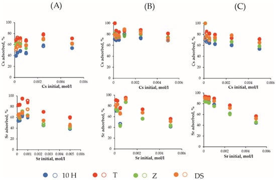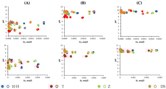 The recovery rate of Cs(I) and Sr(II) from solutions with pH 3 (A), 7 (B), and 10 (C) by bentonites 10H, T, Z, and DS. Empty and filled icons are replications of the experiment.