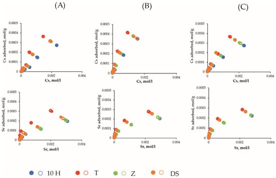 Adsorption isotherms of Cs(I) and Sr(II) on bentonites 10H, T, Z, and DS in experiments with the initial solution at pH 3 (A), 7 (B), and 10 (C). Empty and filled icons are replications of the experiment.
