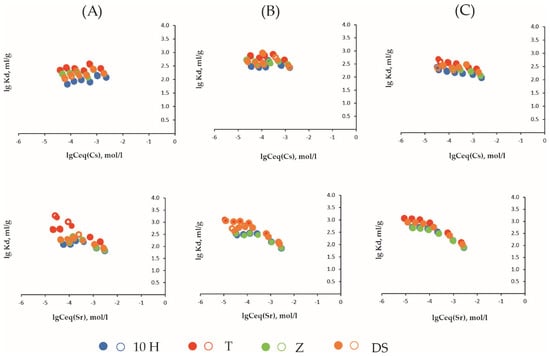 In general, the recovery rate of Cs(I) and Sr(II) from the solutions by the studied clays decreased in the following series of bentonites: T > DS > Z > 10H (Figure 2).