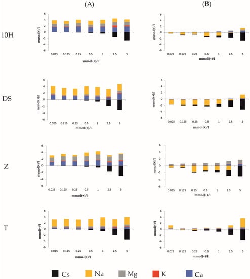 The calculations showed that, in the experiments with pH 3 solutions of cesium nitrates within used concentrations for all clays, the number of equivalents that passed into the equilibrium solution of cations exceeded the equivalent amounts of absorbed Cs(I) (Figure 5A). This means that ion exchange as an absorption mechanism takes place, and exchange reactions are not the only source of cations in the equilibrium solution. Among the cations that passed into solution from DS and T, Na+ is predominant, while Ca2+ and Mg2+ are predominant from bentonites 10H and Z. This can be explained as follows: not only exchange reactions, but also the additional dissolution of salts, primarily carbonates, may result in Na+, Ca2+, K+, and Mg2+ in the equilibrium solution under acidic conditions. Additionally, as mentioned above, ions compete for sorption sites with a proton under acidic conditions, as in the case of the bentonite from the Taganskoe deposit.