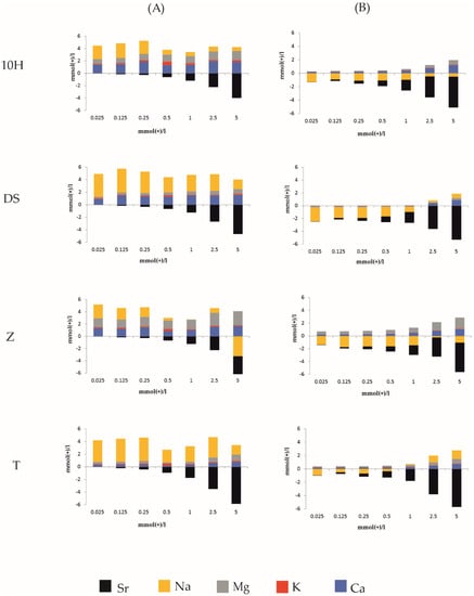 The experiments on the sorption of Sr(II) ions showed similar results (Figure 6A). However, unlike Cs(I) ions, bentonites 10H and Z at the highest concentrations absorb Sr(II) in amounts equivalent to the number of exchange cations passed into the solution. At the same concentrations of Sr(II), bentonites T and DS absorb a few more equivalents of strontium than those released into the solution of cations. It can be assumed that strontium on these bentonites is partially fixed on the pH-dependent positions.