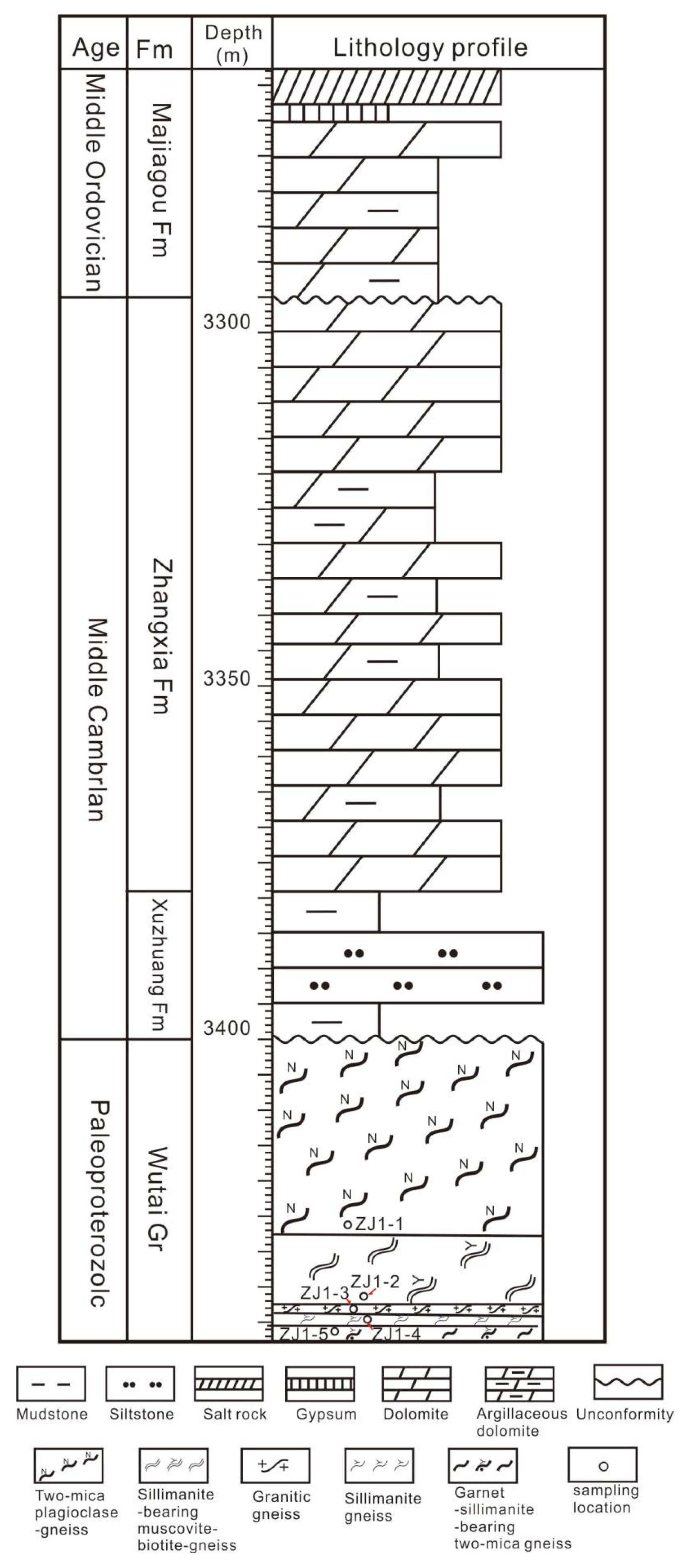 - Wang, W.; Liu, X.S.; Hu, J.M.; Li, Z.H.; Zhao, Y.; Zhai, M.G.; Liu, X.C.; Clarke, G.; Zhang, S.H.; Qu, H.J. Late Paleoproterozoic medium-P high grade metamorphism of basement rocks beneath the northern margin of the Ordos Basin, NW China: Petrology, phase equilibrium modelling and U–Pb geochronology. Precambrian Res. 2014, 251, 181–196. [Google Scholar] [CrossRef]