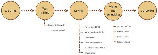 The sample processing and measurement protocol used in this study is divided into five parts that are schematically illustrated in Figure 1. The first part relates to the sampling and reduction of the particles to achieve a size smaller than <75 µm. The second step in the process corresponds to the wet milling, where the particle size was reduced to nano sizes, involving a high-power planetary ball mill. The third part relates to the drying stage of the sample suspension. This step was performed and compared using four techniques to identify the influence of sample preparation parameters on the resulting samples’ chemical distribution. The techniques used were freeze-dried (FD), evaporation (E), vacuum-driven sterile filter (VDSF), and vacuum-driven membrane filter (VDMF). The fourth step corresponds to the pellet pressing, produced both with and without a binder. The homogenization time between the binder and the ore powder was varied at 1 min, 5 min, and 10 min. The last part relates to the chemical characterization of the pellets through LA-ICP-MS and the evaluation of these results.