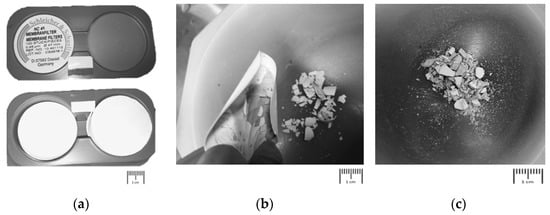 Vacuum-driven membrane filter. (a) Schleicher and Schell filter. (b) Dried particles in the filter. (c) Separation of the particles in the agate mortar.