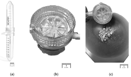Like VDMF, a vacuum-driven sterile filtration process aims to separate solid particles from the sample suspension. The process was performed using a sterile disposable vacuum filter unit from MilliporeSigma. The sterile disposable vacuum filter had double lead thread with vacuum port with a volume of 50 mL. The membrane filter type was Steriflip-GV Filter Unit which has a pore size of 0.22 μm with a filtration area of 7 cm2. After the filtration process, the membrane with all solid particles was placed in the oven at 60 °C for 15 min or until no more liquid remained. Once the particles were dried, they were separated from the filter, placed in an agate mortar, and pestled for manual homogenization. In Figure 3 it is possible to observe the sterile disposable vacuum filter unit, the filter with dried particles, and how to separate them from the filter.