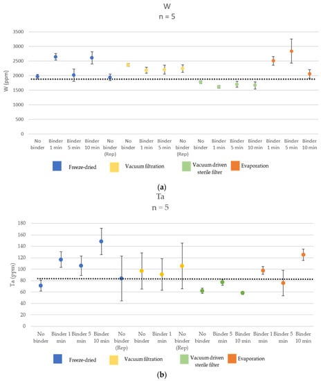 Another trend occurring throughout the dataset is that all element concentrations from VDSF were lower than the concentrations from the rest of the techniques in all cases (Figure 4); between 10% and 18% lower for W, from 21% to 40% lower for Ta, and between 12 and 22% for Sn. These low concentrations represent mineral particles lost from the sample during drying, rendering VDSF unreliable. However, the standard deviations from VDSF are also low, suggesting that this drying method results in a homogenous pellet of the particles that do pass the filter stage. VDSF may thus still be recommended for finer grinded grain sizes. The loss of particles due to incomplete rinsing after each grinding session is disregarded as a possible source of lower concentrations in the LA-ICP-MS spot analyses than the reference values in our methodological procedure since we followed the protocol established by Garbe-Schönberg and Müller, 2014 [2], to ensure that no particles remained on the milling balls after grinding.