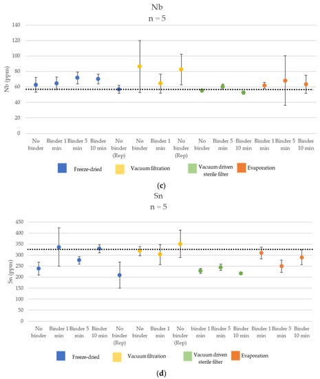 Apart from helping the mechanical properties, the use of binders in the pellets did not result in differences in the element concentrations compared to samples produced without binders (Table 2, Table 3, Table 4 and Table 5), indicating that binders allow high repeatability and accuracy of measurements [10]. The diluting effect of the chemical binder that caused a lower concentration of some elements in powder-pressed pellets noted in the study of Liu et al., 2013 [6] was not detected during our analysis. The utilization of binders may thus allow drying techniques, such as evaporation or filtering, that are faster, easier, and economically viable to apply than freeze-drying in pellet production chains. Furthermore, the homogenization time between the ore powder and the binder did not influence the results of the values. The pellets with binder homogenization times of 1 min, 5 min, and 10 min show low variability values in almost all analytical runs (Figure 4a). It was also observed that the use of cellulose binders in a mass ratio of sample to the binder of 4:1 enhances the compatibility and mechanically stability of the pellets in addition to improving measurement repeatability and accuracy [2,5,6,7].