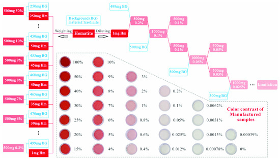 Two types of materials were used in this study—manufactured materials and natural samples. Manufactured materials have the advantage of known composition and consistent physical characteristics with no contaminants [32]. In this study, 31 manufactured samples with different hematite concentrations were made by fully mixing different proportions of stoichiometric kaolinite (Al2Si2O5(OH)4, light color, CAS: 1332-58-7, Lot: P1501105, produced by the Shanghai Titan Scientific Co., Ltd., Shanghai, China) and hematite (α-Fe2O3, red color, CAS: 1317-60-8, Lot: 32446800, produced by Strem Chemicals, Inc., Newburyport, MA, USA) in an agate mortar. A Mettler Toledo LE104E/02 balance (0.1 mg actual graduation value and 1 mg scale verification value) was used for weighing. To ensure the accuracy of the proportion, manufactured samples were prepared using two methods (Figure 1): (1) The weighing method. For manufactured samples with hematite content ≥ 0.2%, the required amounts of hematite and kaolinite were weighted separately, and then mixed to produce 500 mg samples. (2) The diluting method. For manufactured samples with hematite content < 0.2%, the balance cannot weigh the required amount of hematite due to its precision limit. Therefore, a manufactured 500 mg sample with 0.2% hematite was diluted by adding 500 mg kaolinite repeatedly to obtain the manufactured samples with different proportions of hematite.